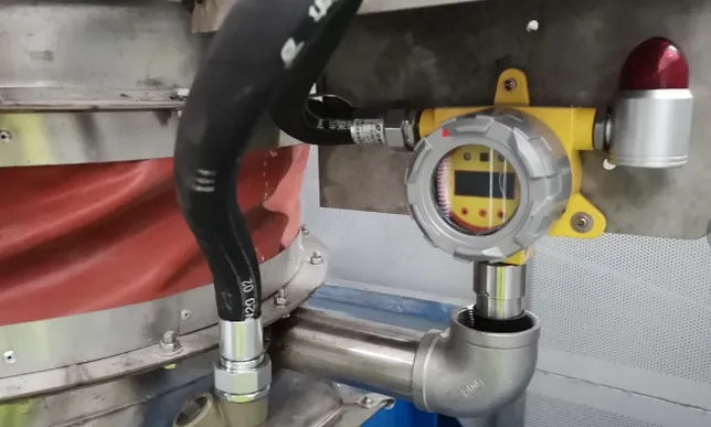 除塵系統(tǒng)排氣筒裝有可燃?xì)怏w報(bào)警器,數(shù)值通過PLC采集到現(xiàn)場主控柜,同時(shí)除塵器外部及投料口側(cè)吸罩頂部分別裝有可燃?xì)怏w濃度報(bào)警器,數(shù)值均傳送到中控室。