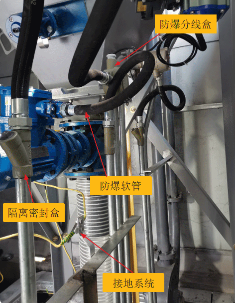 為了消除著火源,團(tuán)隊(duì)對整個(gè)系統(tǒng)做了接地和電氣防爆等處理。例如,對MIB主設(shè)備殼體、氣包、卸灰和管鏈系統(tǒng)等進(jìn)行可靠接地;對不銹鋼風(fēng)管法蘭連接處及除塵軟管增加靜電跨接線。同時(shí),系統(tǒng)不使用任何銅制配件,安裝專用接地網(wǎng)。此外,除塵主控制系統(tǒng)采用正壓防爆柜體,上電前充入隔離氣體,并保證100~200Pa 左右的正壓力;現(xiàn)場布線采用防爆軟管、防爆分線盒和隔離密封盒等措施,特殊地方用密封膠泥封堵等。