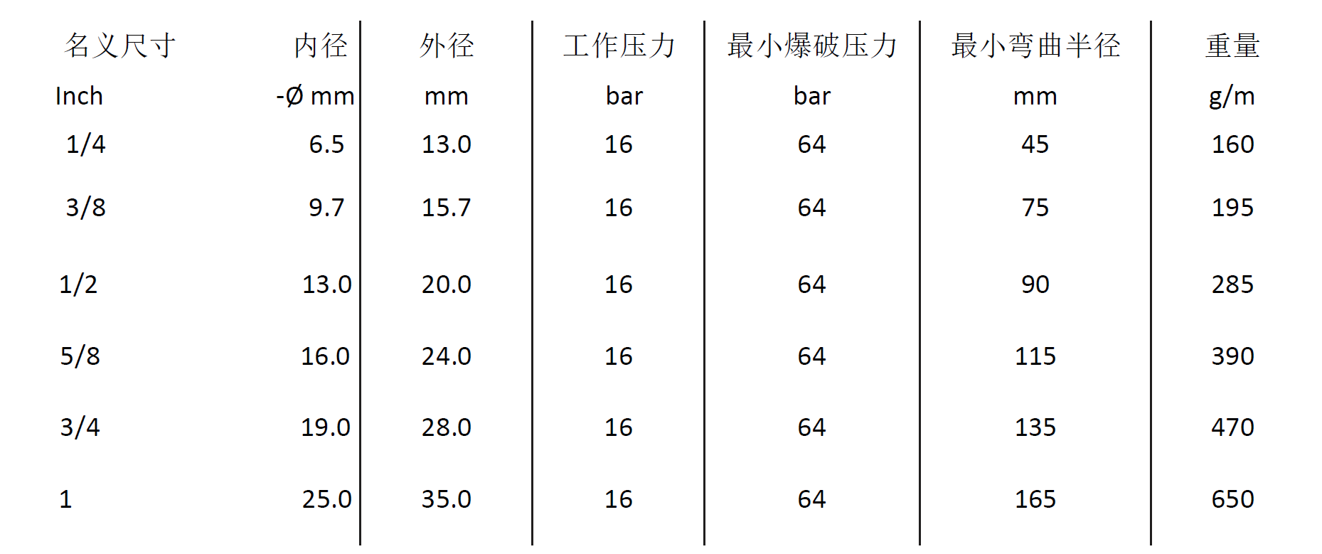 壓力基于室溫。高壓和/或高溫會降低軟管的耐久性。