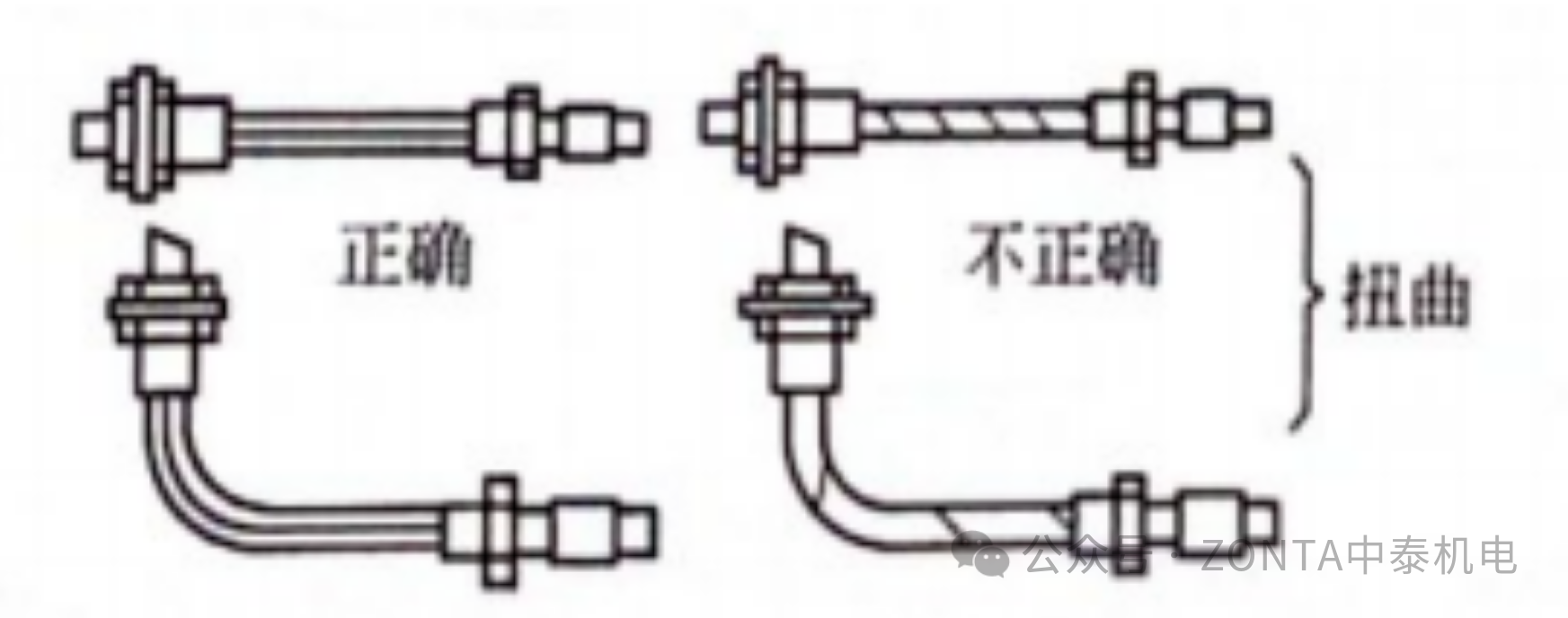 3、由于管子的彎曲角度不對(duì)(下圖a),以及接管長(zhǎng)度不對(duì)(下圖b),管接頭擴(kuò)口處很難密合,造成泄漏。為保證不漏,應(yīng)使彎曲角度正確和控制接管長(zhǎng)度適度(不能過(guò)長(zhǎng)或過(guò)短)。