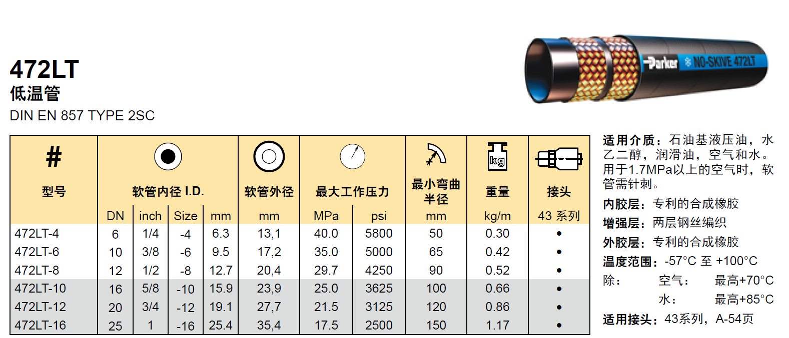 常規(guī)液壓軟管的額定工作溫度最低為–40°C,而Parker的低溫液壓軟管,可以達(dá)-57°C。